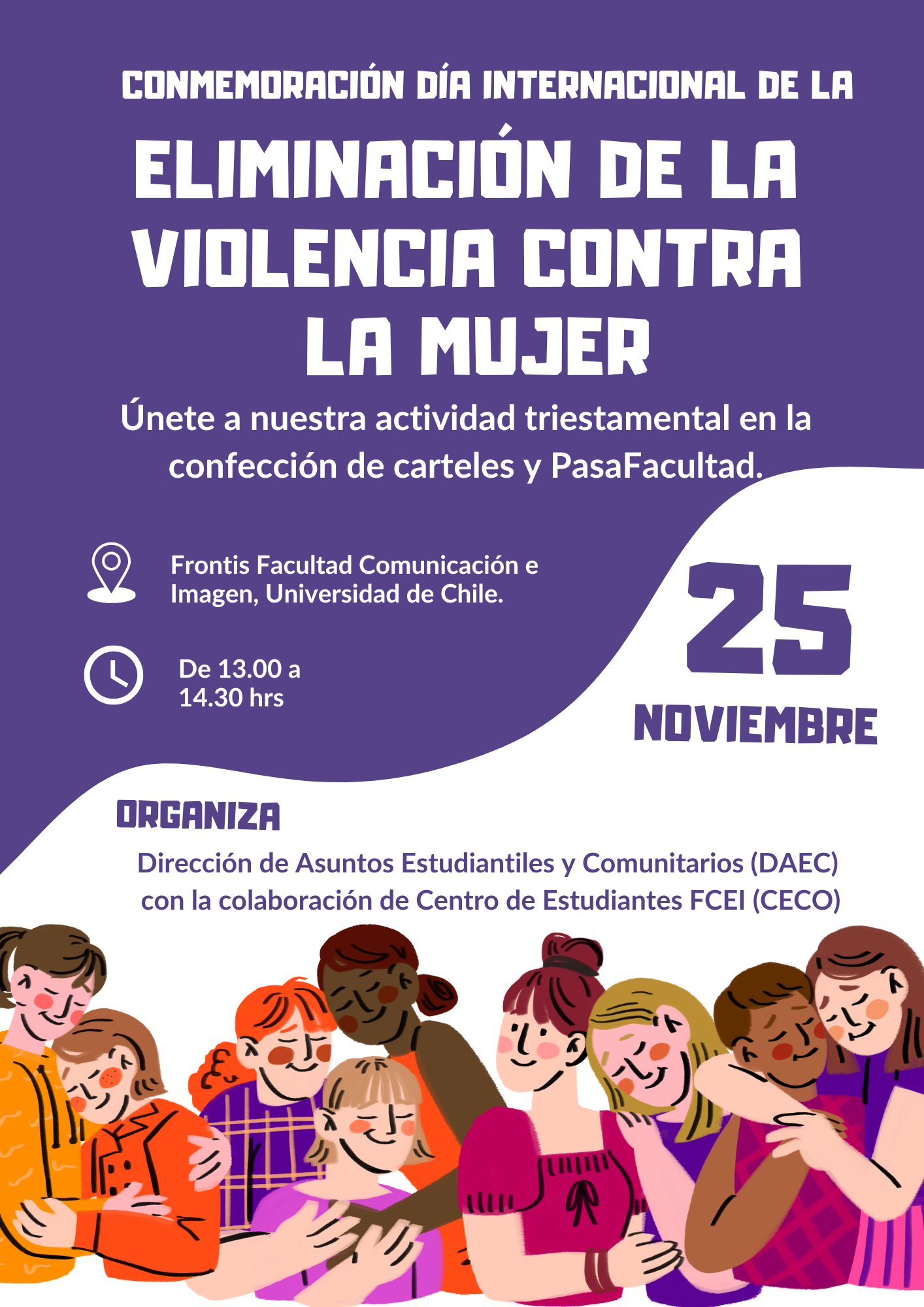 - 13:00 - 14:00: Creacion de pancartas con frases alusivas a la conmemoracion, con la participacion de estudiantes, funcionarias y academicas. La actividad sera guiada por integrantes de la DAEC y estudiantes del Centro de Estudiantes, y se dispondra de musica para incentivar la participacion.
