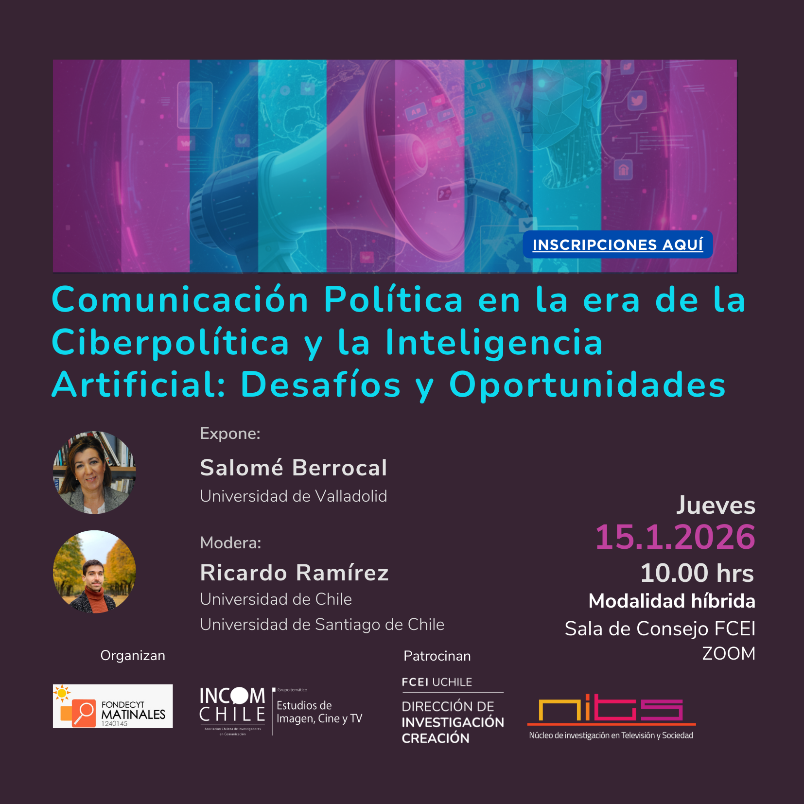 La Dirección de Investigación Creación, en conjunto con el Núcleo de Televisión y Sociedad, tiene el agrado de invitarles al conversatorio “Comunicación Política en la era de la Ciberpolítica y la Inteligencia Artificial: Desafíos y Oportunidades” a realizarse el día jueves 15 de enero de 2026 desde las 10:00 a 12:00 horas en la Sala del Consejo del FCEI (participación presencial) o por ZOOM (participación virtual). El conversatorio es organizado por el proyecto ANID/ Fondecyt Regular/ Folio 1240145.