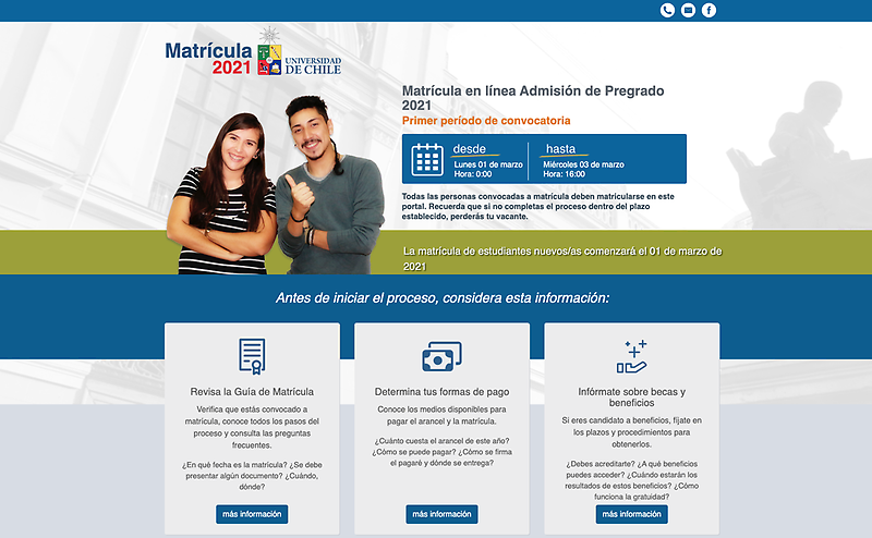 Con un proceso de matrícula en línea completamente reforzado para evitar aglomeraciones presenciales, la Universidad de Chile se prepara para recibir a su generación 2021, la que podrá matricularse desde las 00:01 horas del lunes 1 de marzo en el portal https://matricula.uchile.cl/