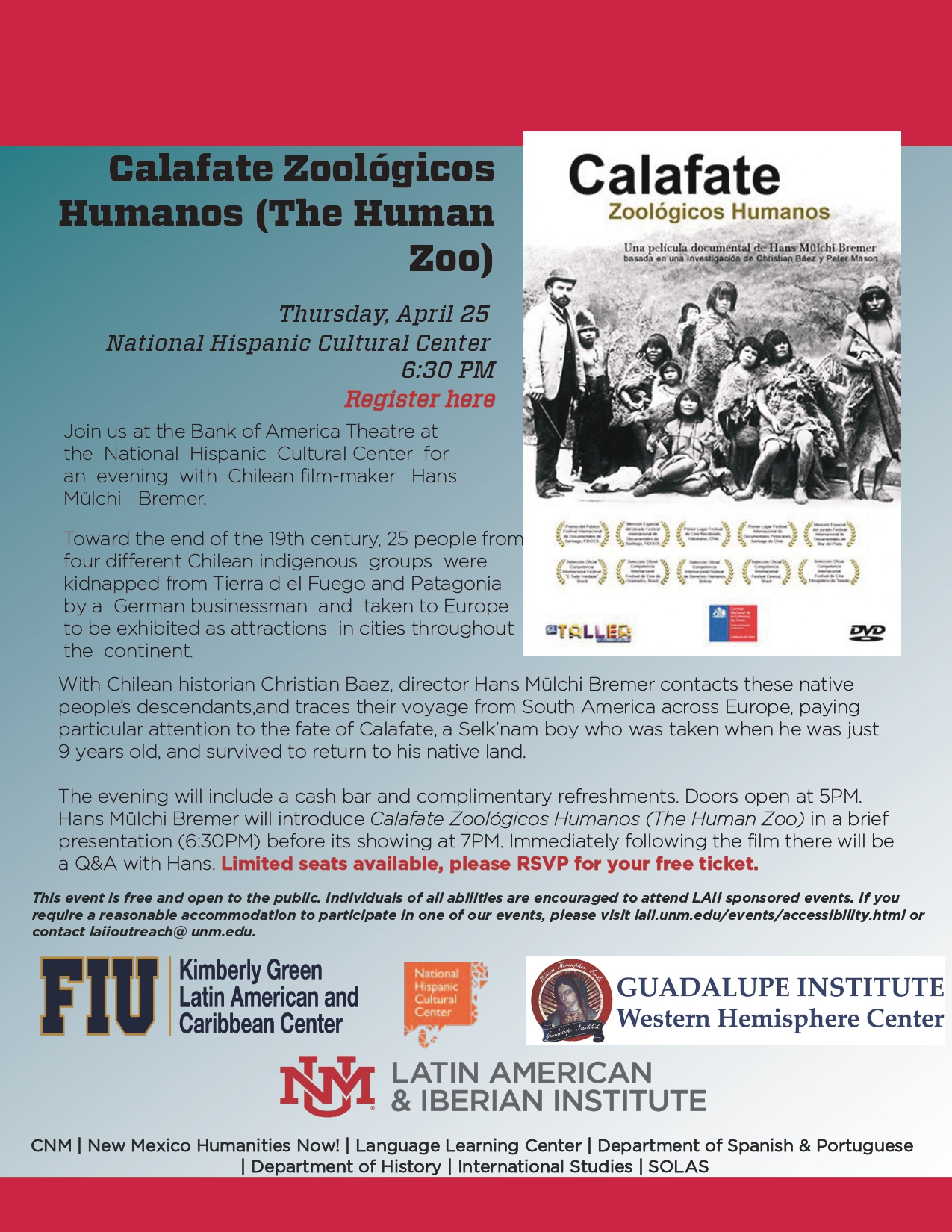 Además, Hans Mülchi, también académico de FCEI, asistirtá a la Universidad de Nuevo México (EE.UU.) entre el 23 y 28 de abril a una serie de actividades relativas a su trabajo como documentalista. Ofrecerá la conferencia Filming the invisible: Hidden stories of Indigenous cultures, donde se exhibirá su película Calafate, Zoológicos Humanos (2010, 90”).